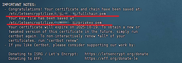 通过后会颁发一个公钥fullchain和密钥privkey
