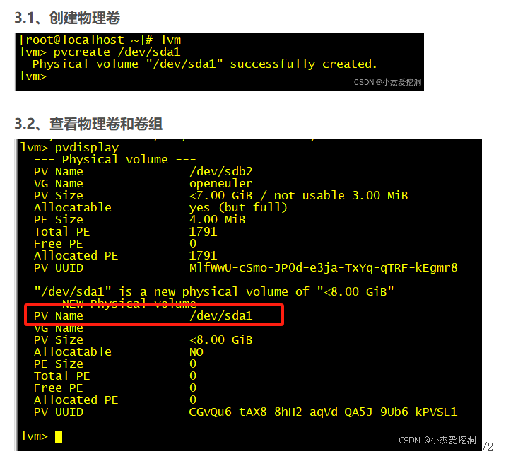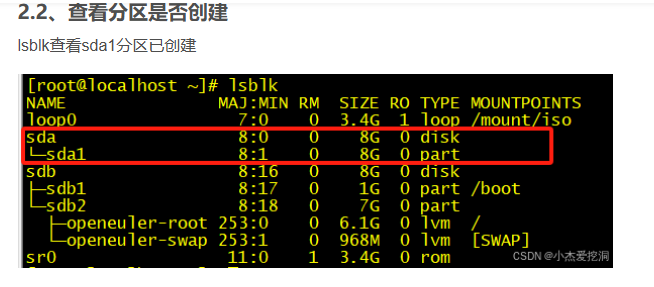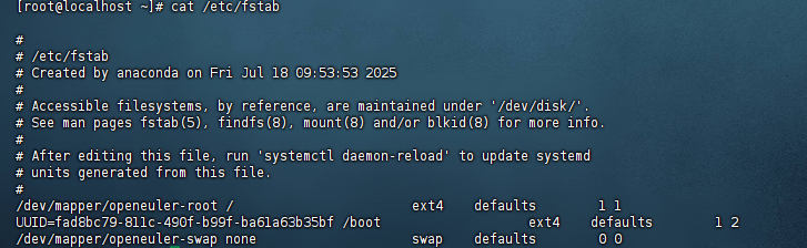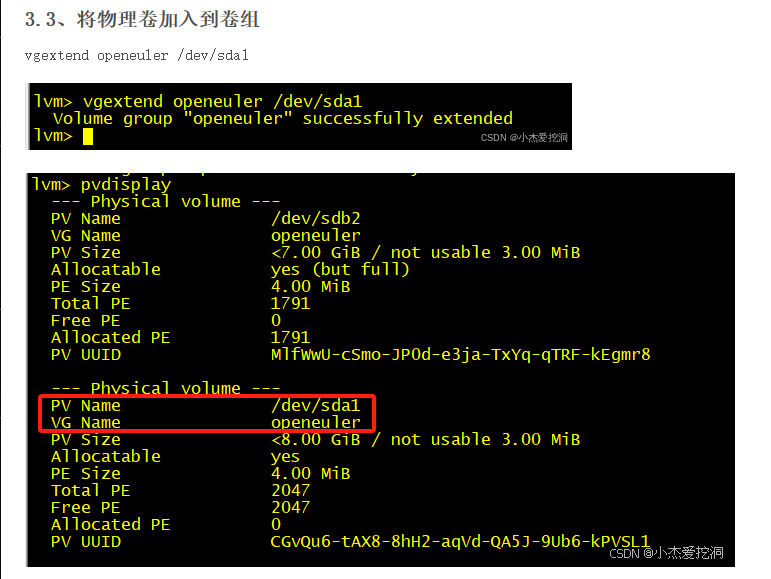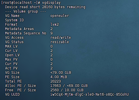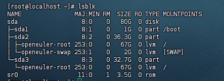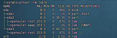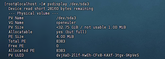 通过lsblk得知,我们要对根目录扩容,则可以看到卷组是openeuler,逻辑卷是root(下图)