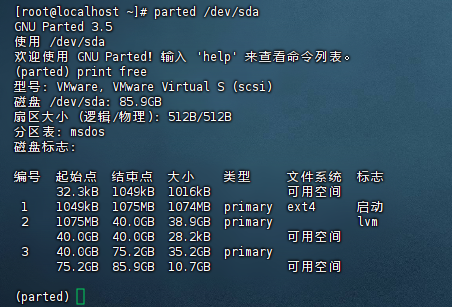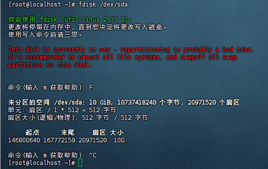 可以看到sda还有10G没有分区,验证了前面说的10G还没分区