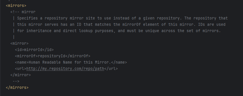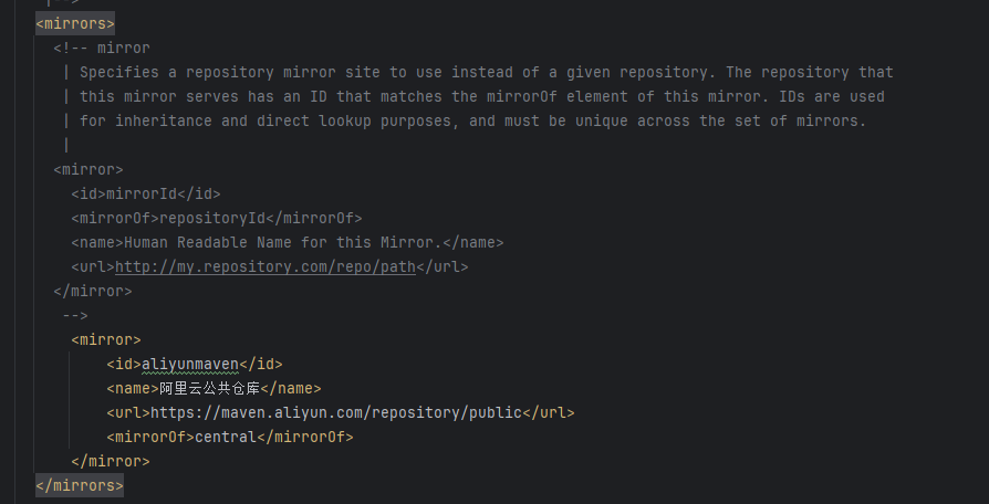 3、在mirrors标签中填写镜像地址,这里使用的是阿里云的maven仓库地址