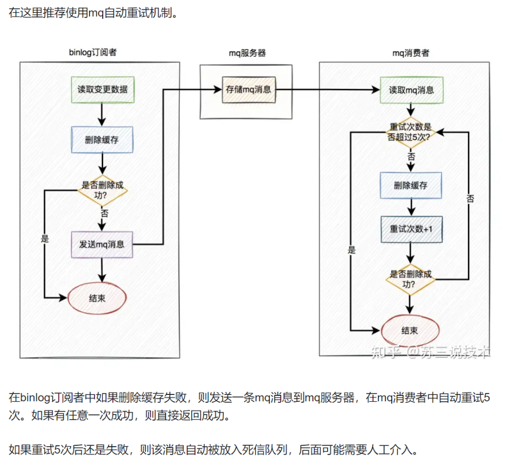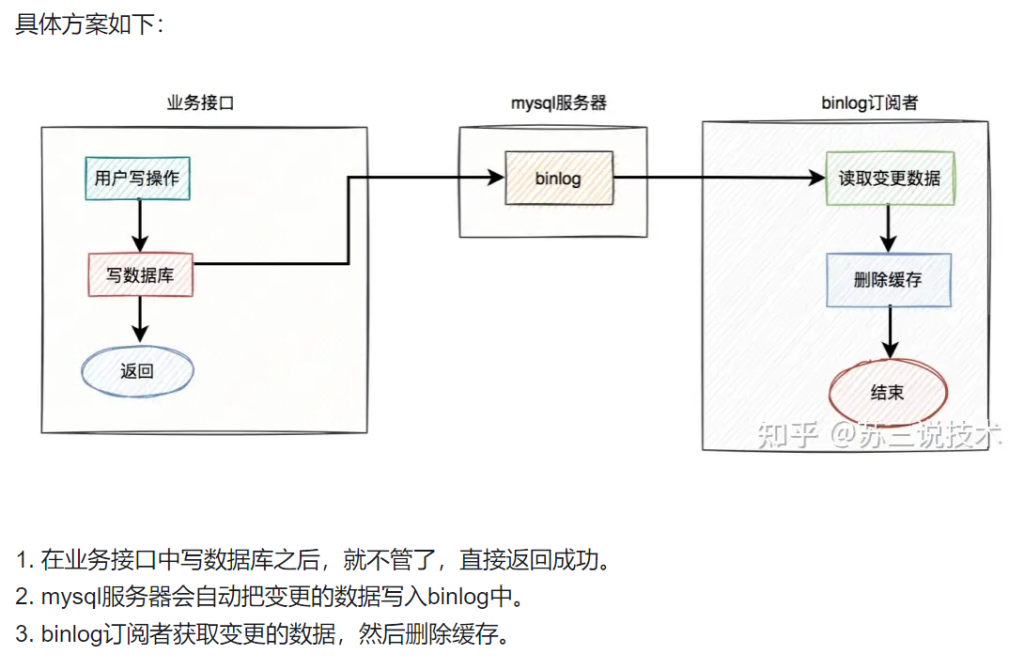 数据库的更新操作都会记录到binlog里面,可以通过阿里开源的框架canal监听binlong,得到具体要操作的数据之后,再执行删除缓存,删除的时候,借助消息队列,如果删除失败的话,可以进行重试