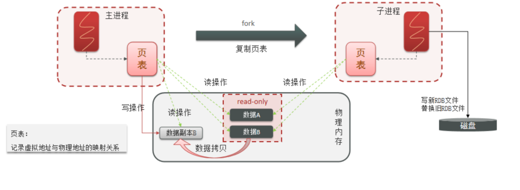 bgsave开始时会fork主进程得到子进程,子进程共享主进程的内存数据。完成fork后读取内存数据并写入 RDB 文件。fork采用的是copy-on-write技术: