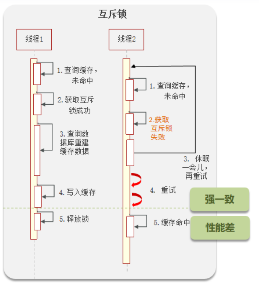 - 使用互斥锁,强一致,性能差,让其中一个线程获取锁并访问数据库加载数据并缓存,其他线程获取不到锁便重试获取缓存,获取到锁的线程则会加载数据到缓存中