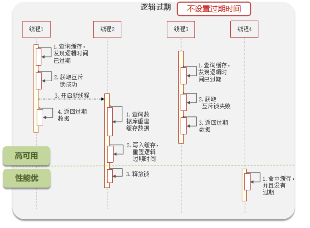 - 逻辑过期,高可用,性能优,不能保证数据绝对一致。设置当前key逻辑过期