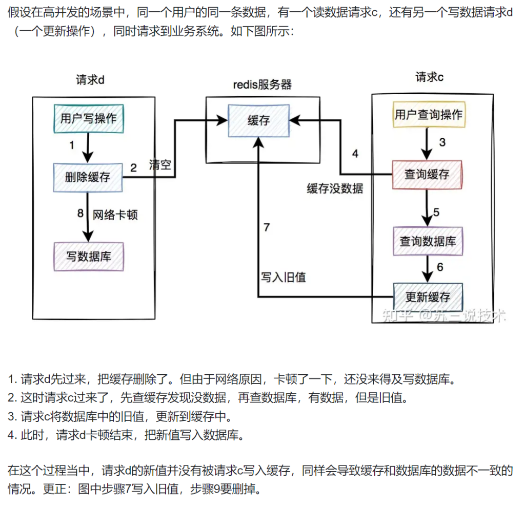 不一致(修改数据库到删除缓存这段时间,缓存里面还是旧的数据,其它请求能读到旧数据,